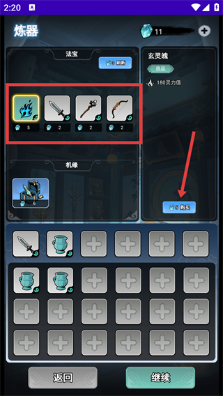 4、进入炼器界面,选择红色框内的法宝,点击【购买】按钮,获得新法宝提升实力。