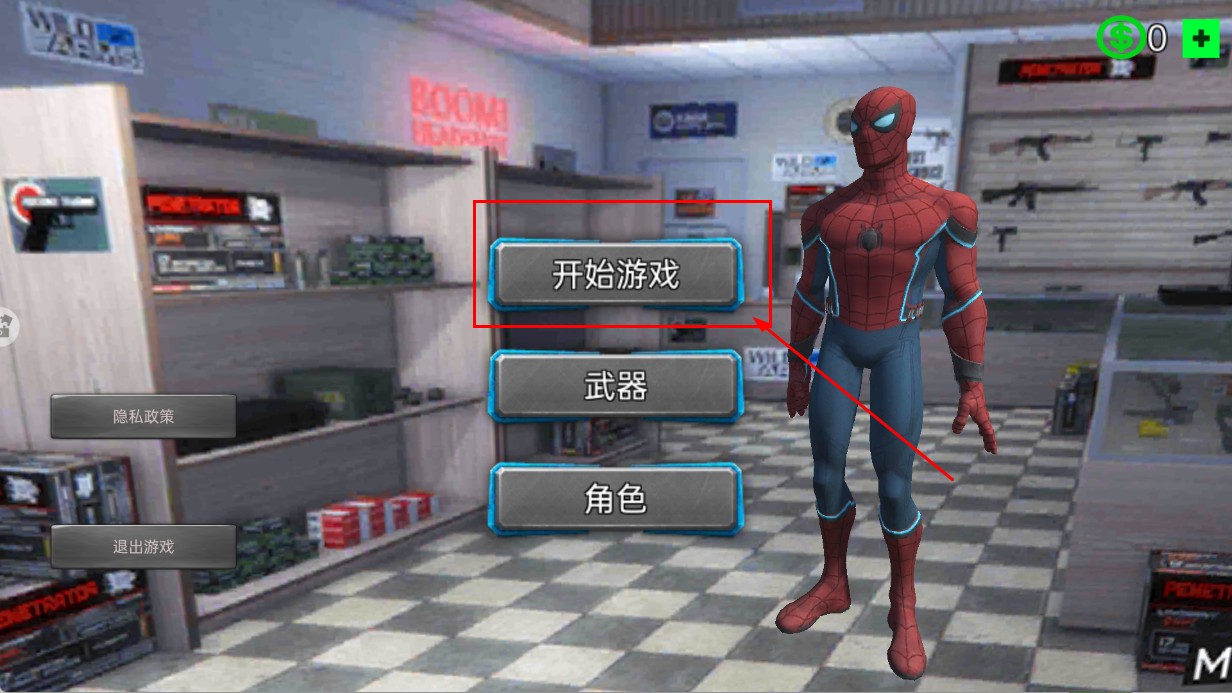 1、进入游戏初始界面,点击【开始游戏】进入城市,可先通过【武器】-【角色】界面做好战前准备提升初期作战能力。