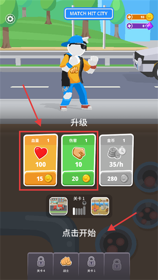 1、游戏开始前可升级角色,花费【15】金币将血量提升至【100】,增强生存能力,为战斗做好准备。