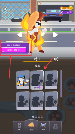 4、积累【500】紫币可解锁【特工-热狗】皮肤,解锁后更换皮肤,或提升角色战力。