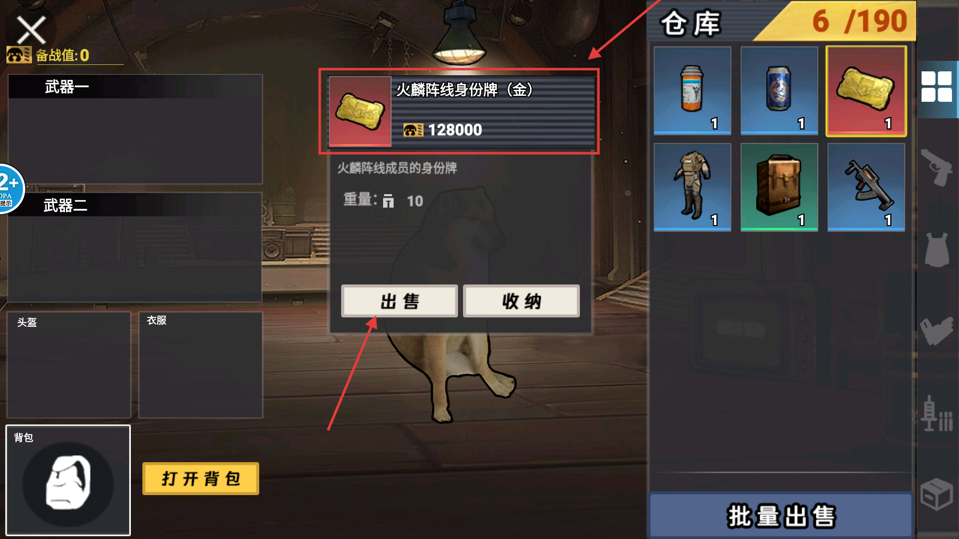 1、出售【火麟阵线身份牌(金)】可获得备战值,用于后续购买装备提升角色战斗生存与输出能力。