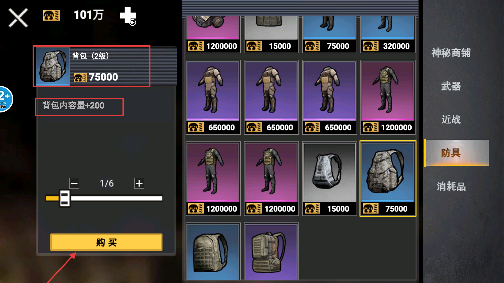 2、在神秘商铺花费【75000】备战值购买【背包(2级)】,能增加背包容量方便携带更多战斗物资。