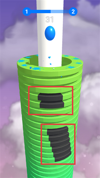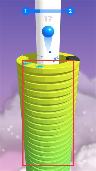 2、操控蓝色球向下掉落,击碎红色框内的黄色和绿色堆栈层,积累分数。