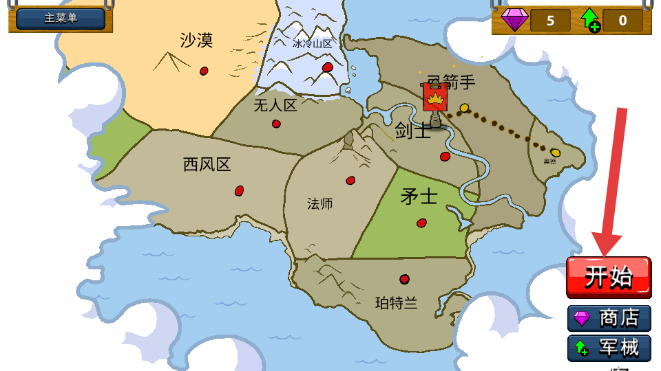 1、在地图界面,点击【开始】按钮选择区域开启战斗,可根据不同区域的兵种特点制定策略。