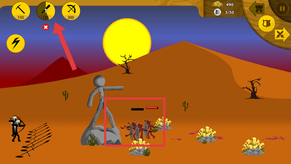 2、战斗中,消耗资源生产剑士等兵种,利用他们抵御敌方进攻,逐步推进战局。