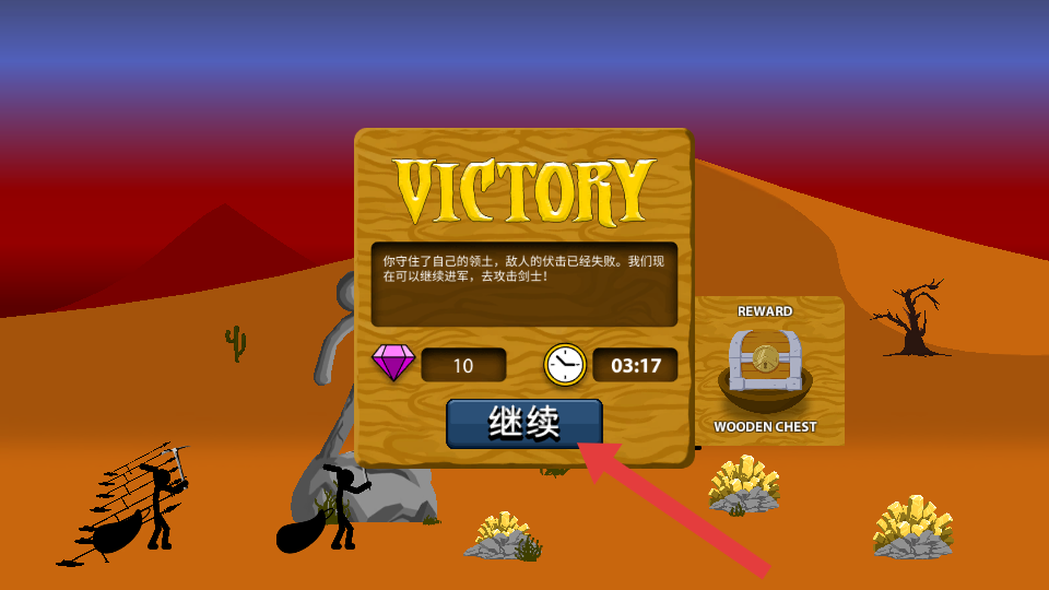 4、战斗胜利后,点击【继续】按钮,可获取奖励并继续挑战下一场战斗,解锁更多游戏内容。