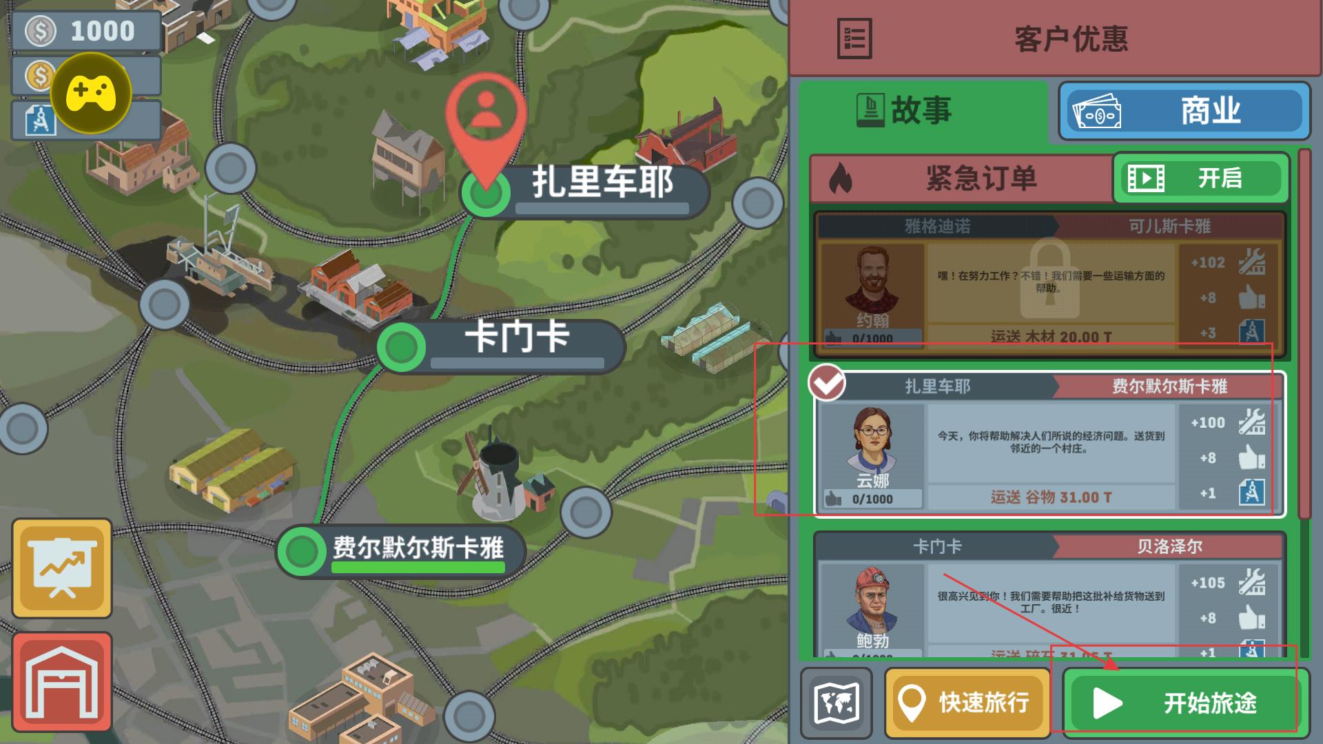 1、在地图界面选择配送订单,确认需运送的物资类型与数量后,点击开始旅途启动运输任务,完成订单可获取资源与声望奖励。