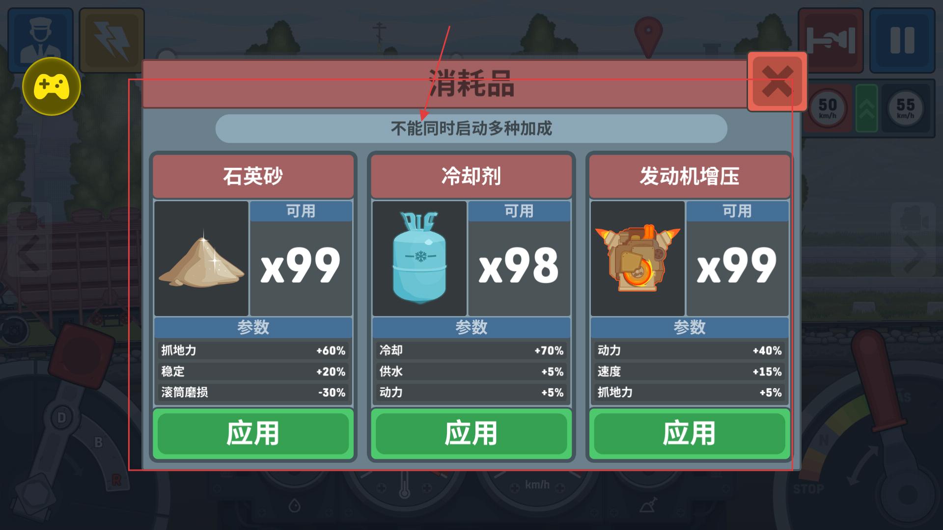 3、打开消耗品界面,选择如石英砂、冷却剂等道具点击应用,可临时提升列车的抓地力等属性,但需注意不能同时启用多种加成。