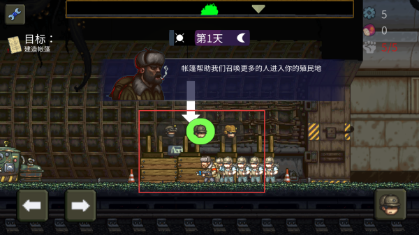 2、将流浪者部署到帐篷区域,完成【建造帐篷】的目标,推进第1天任务。