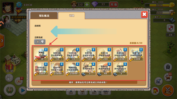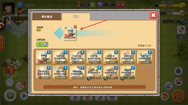 3、选择目标士兵类型,点击后进入训练进度阶段。