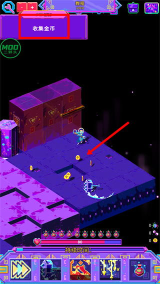 3、将敌人消灭后,按照【收集金币】的提示,收集红色箭头指向的金币,积累资源。