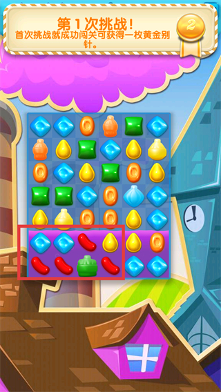 2、游戏中,找到红色框内的同色糖果,通过交换位置进行消除,完成消除任务。
