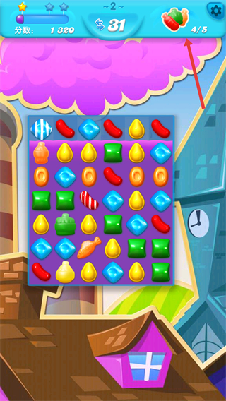 3、关注右上角的目标进度(如红色箭头指向的4/5),根据目标要求消除对应糖果,推进关卡进度。