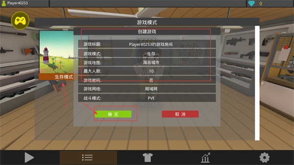 1、玩家可在【创建游戏】界面选择【生存模式】,确认【海岛都市】地图等参数后点击确定,即可进入对应生存场景。
