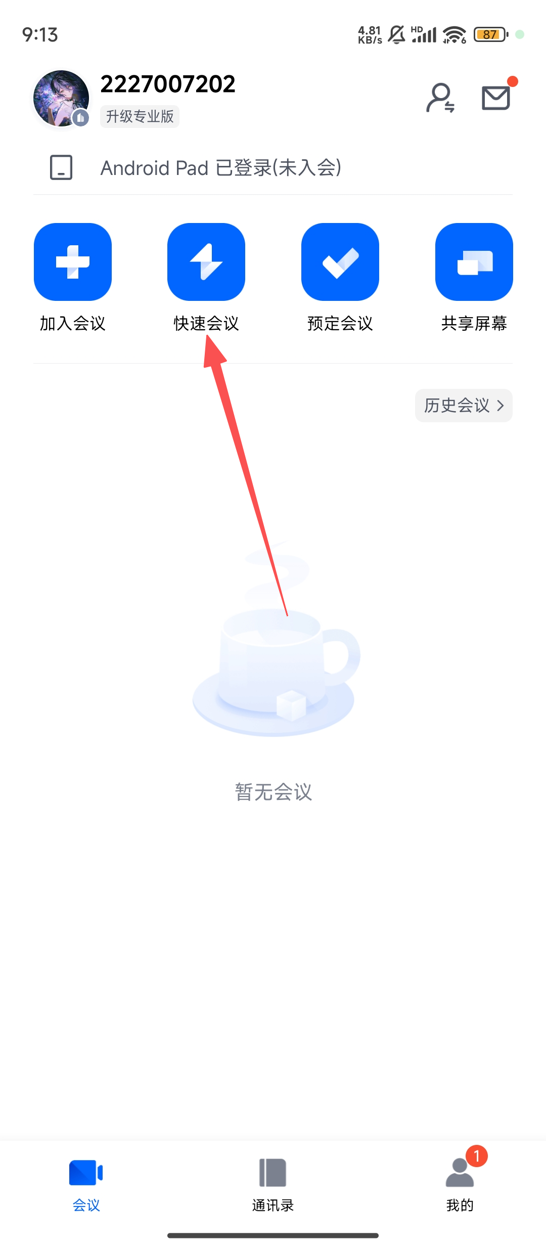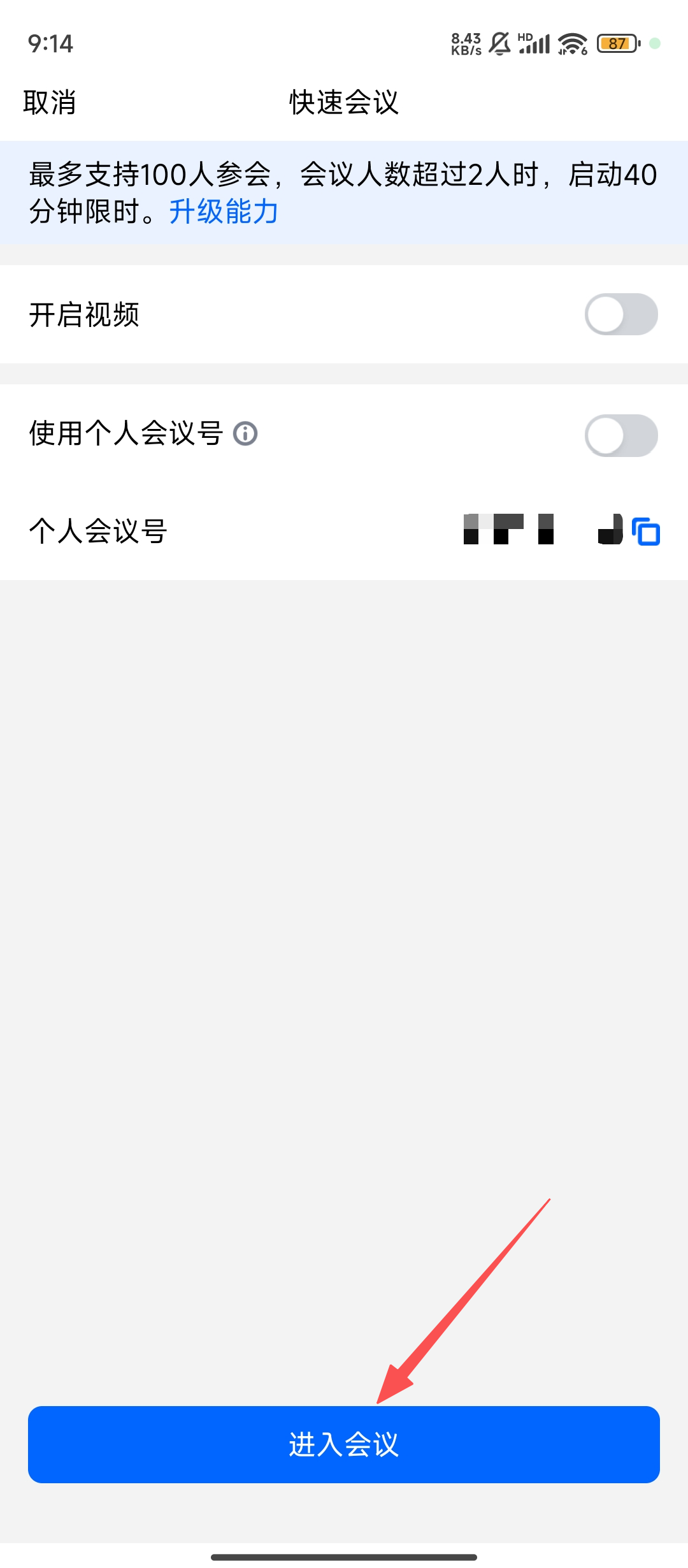 2、进入【快速会议】设置页,可按需选择是否开启视频、使用个人会议号,确认后点【进入会议】即可。