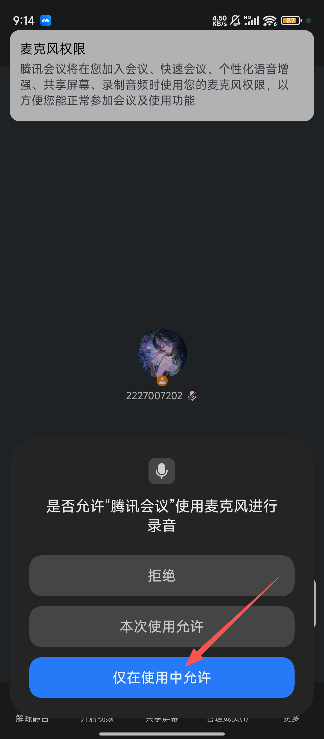3、首次进入会议时,会弹出麦克风权限申请,选择【仅在使用中允许】,就能正常使用麦克风参与会议啦。