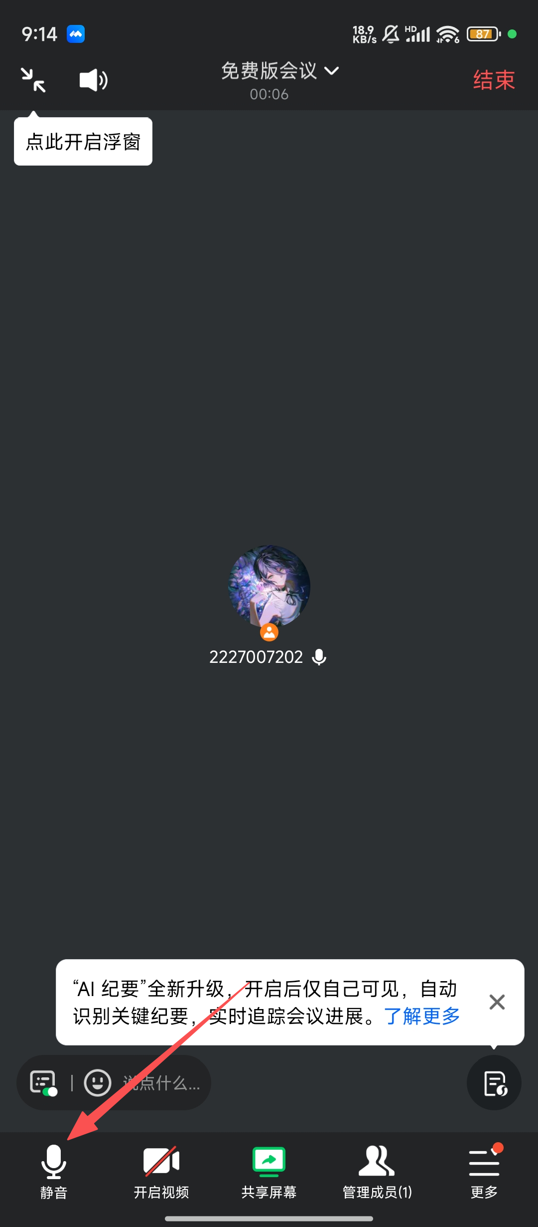 4、进入会议后,若想静音,点击底部工具栏的【静音】按钮,麦克风就会关闭,避免背景音干扰会议。
