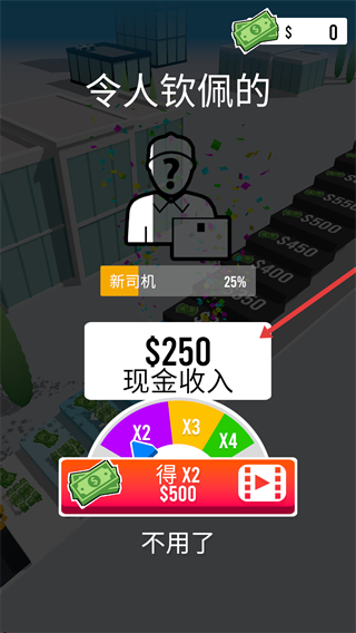 4、完成关卡后,可直接领【$250】现金,或看视频获翻倍奖励,完成收益结算。