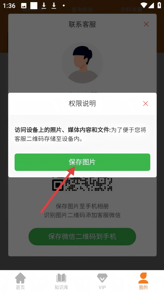 4、在权限说明弹窗中,点击【保存图片】按钮,可将客服二维码存储至设备内。