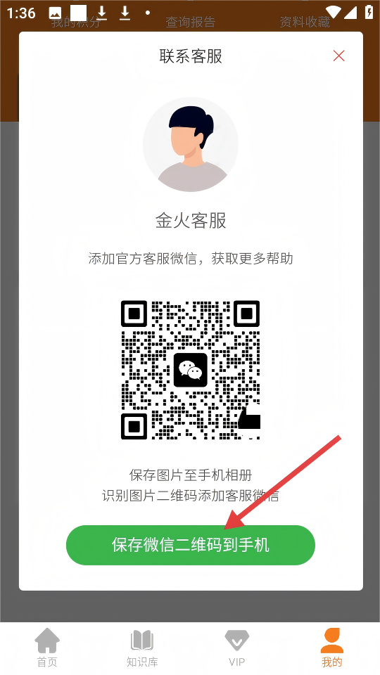 3、在联系客服窗口中,点击【保存微信二维码到手机】按钮,可将客服微信二维码保存至手机相册。