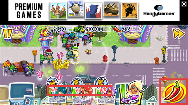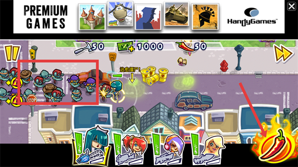 3、攻击左侧僵尸,点击右侧辣椒图标使用技能。