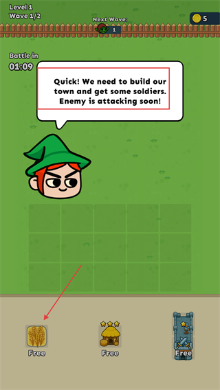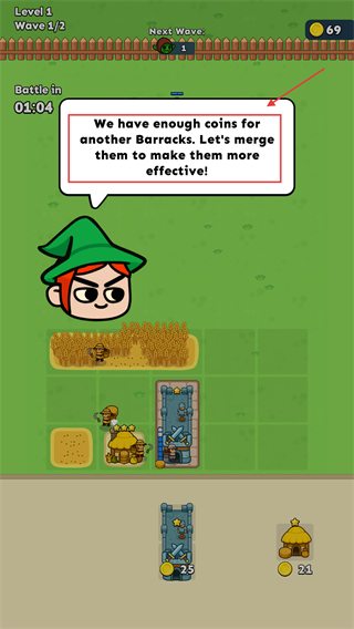 4、金币充足时建造【兵营】,合并兵营可提升士兵产出效率,更高效应对敌人进攻。
