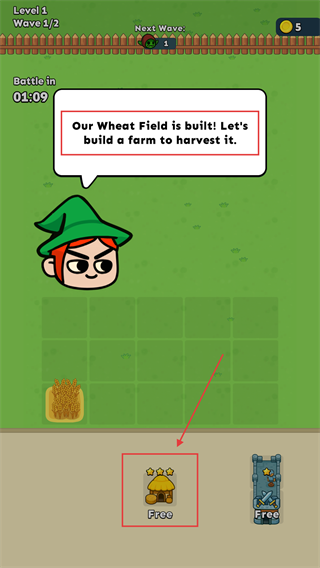 2、麦田建成后立即建造【农场】,通过收割小麦积累资源与金币,解锁更多玩法内容。