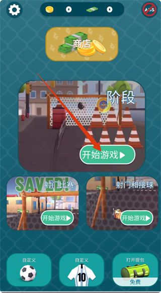 1、在游戏主界面,点击【阶段】下方的【开始游戏】按钮,即可进入足球射门游戏环节。