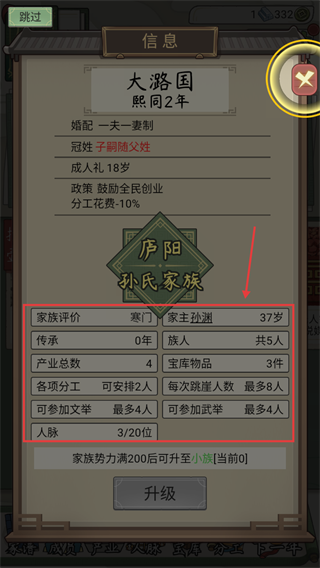 1、关注家族基础数据【寒门-孙渊-37岁-5人-4产业】,合理安排分工与科举参与,积累势力升至小族。