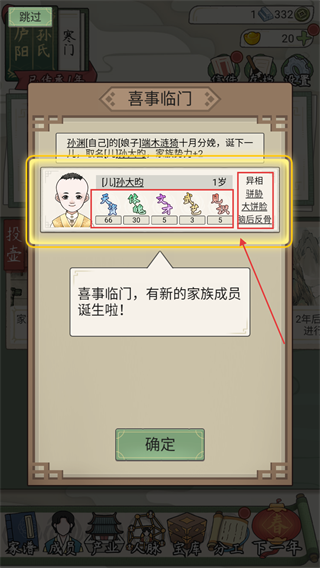 2、新生儿【孙大昀-1岁-天资66-体魄30】有异相特征,可根据数值规划培养方向,助力家族发展。