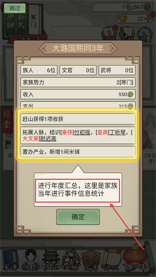 3、年度汇总显示人脉拓展与产业新增,需关注收支平衡,通过结识【豪侠-皇商-大文豪】提升实力。