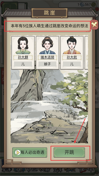 4、处理族人跳崖请求,选择合适族人点击【开跳】,获取奇遇改变命运,为家族带来新机遇。