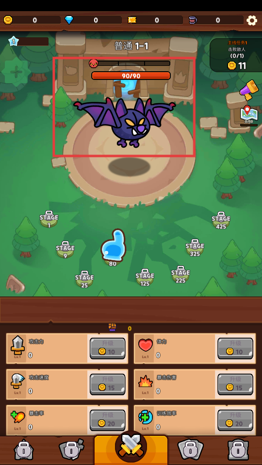 1、通过点击屏幕击败蝙蝠敌人,推进游戏进程。