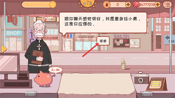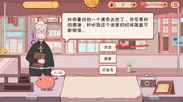 1、与顾客对话时选择【交谈】选项,倾听其诉求,完成互动以推进服务流程,积累顾客好感。