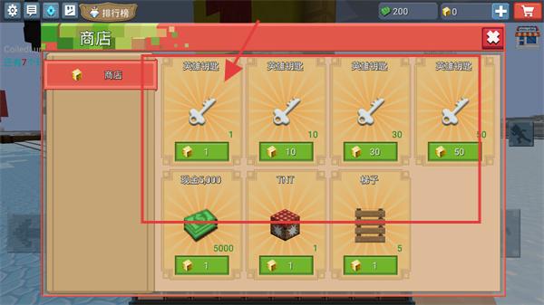 1、在商店界面消耗对应货币购买“实验钥匙”,不同钥匙(如1把/10把)对应不同资源,也可直接购买砖块等基础物资。