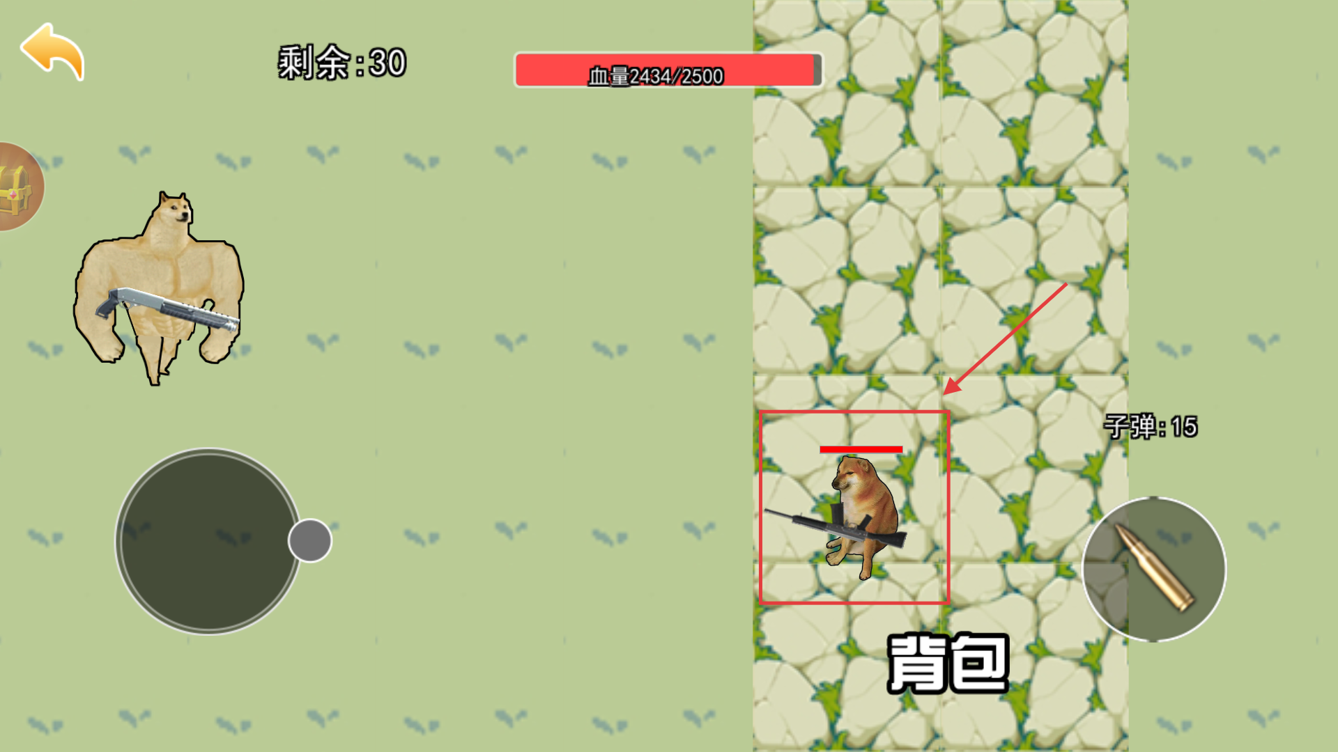 2、战斗时控制角色移动射击,通过【背包】切换武器,剩余【子弹15】时及时补充,应对前方敌人进攻。