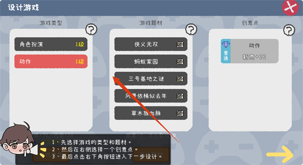 4、在设计游戏时,先选择游戏类型和题材,再选创意点,最后点击下一步按钮,推进游戏开发流程。