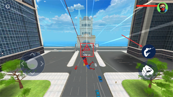 2、点击右侧蛛丝类技能,触发攀爬/滑翔效果,让角色在建筑间移动。