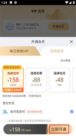 3、点击【开通会员】后,进入套餐选择界面,可看到【连续包年】【连续包季】等套餐,选好后点击【立即开通】。