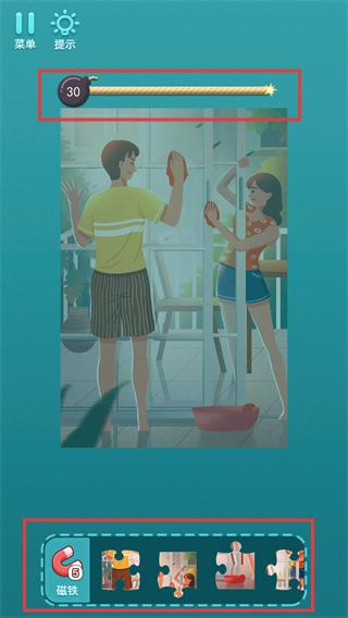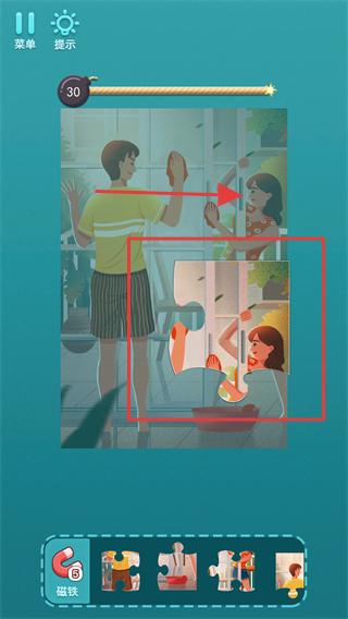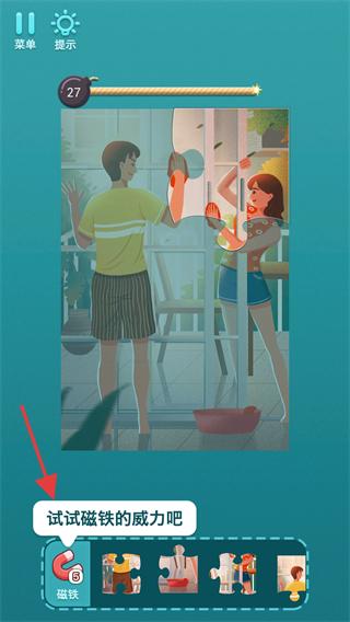 3、根据提示【试试磁铁的威力吧】,点击底部磁铁道具,辅助快速匹配拼图块的位置。