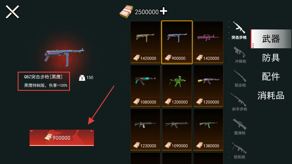 1、在武器界面用900000货币购买QB2突击步枪【黑鹰】,该武器伤害加100%,能大幅提升初期战斗的胜率。