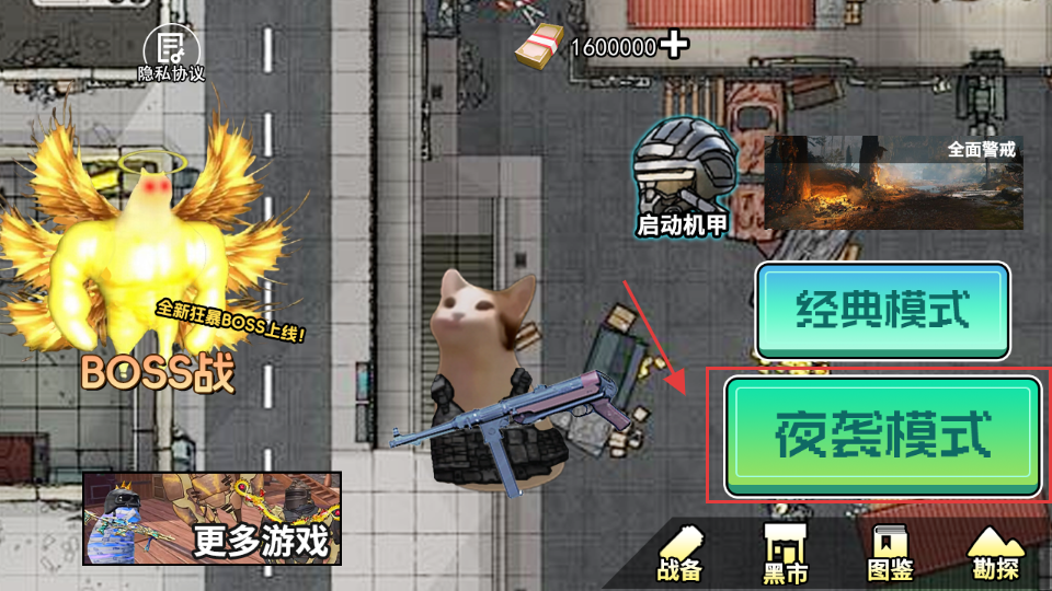 2、选择夜袭模式进入战斗,可启动机甲增强防御与火力,配合猫猫角色灵活身段应对敌人突袭。