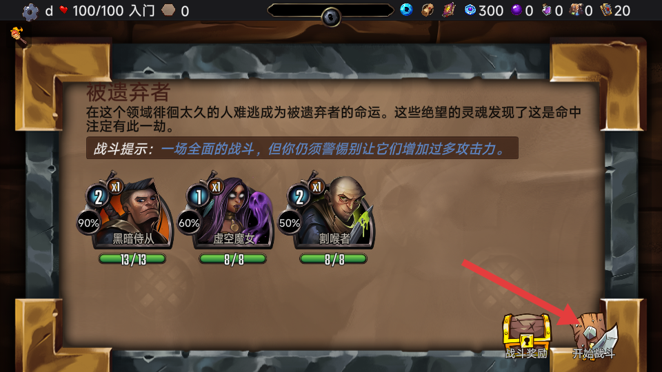 2、点击【开始战斗】,进入与被遗弃者的战斗,关注战斗提示,合理应对敌人。