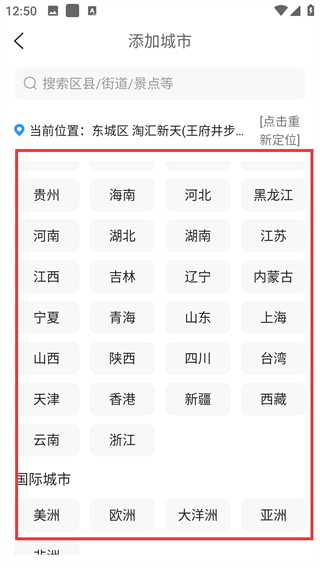 3、在添加城市界面,可通过搜索栏输入目标位置,或直接选择省份/国际城市,选定要切换的位置。