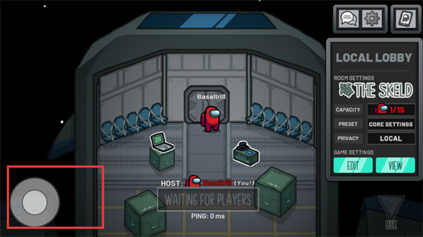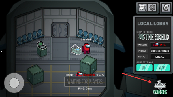 2、进入【LOCAL-LOBBY】房间,当前房间地图为【THE-SKELD】,容量1/15,可作为【HOST】等待其他玩家加入,也可调整房间设置。