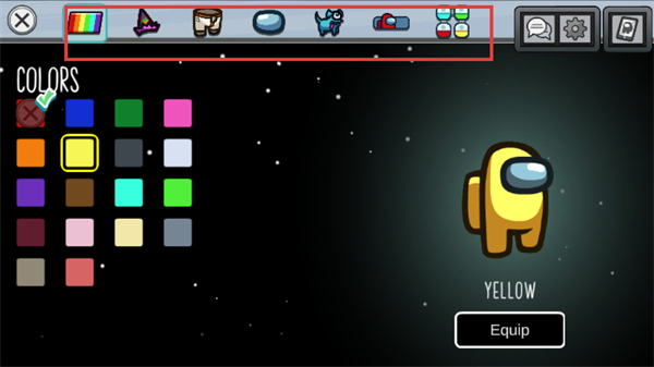 4、在装扮界面选择【COLORS】分类,选中黄色后点击【Equip】应用,也可搭配顶部的帽子、皮肤等装扮,自定义角色形象。