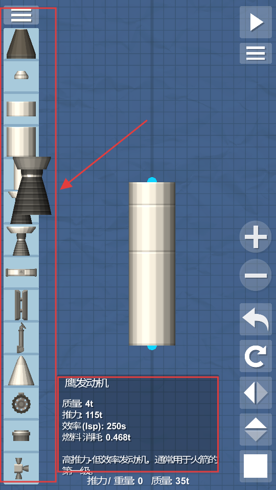 2、在组装界面左侧零件栏选部件,添加【鹰发动机】到火箭,查看其质量推力参数确保与火箭适配。