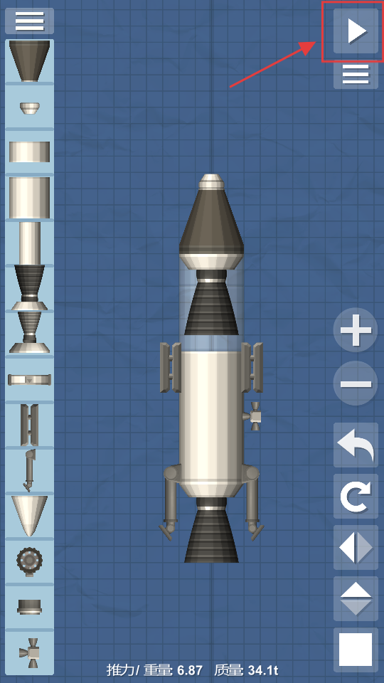 3、完成火箭组装后,点击界面右上角的播放按钮,启动发射流程让火箭进入发射准备状态。