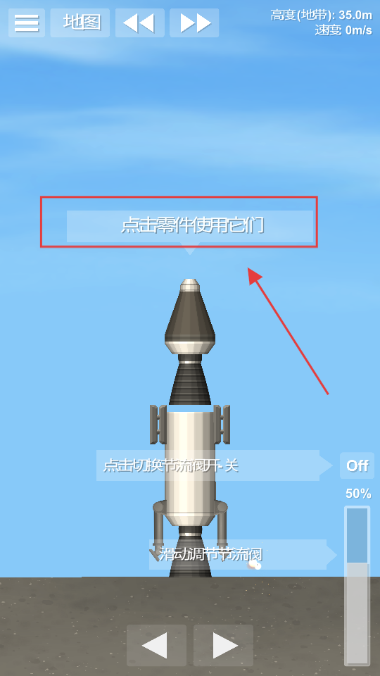4、发射阶段按提示点击零件使用,切换节流阀开关并滑动调节,控制火箭的推力和上升状态。