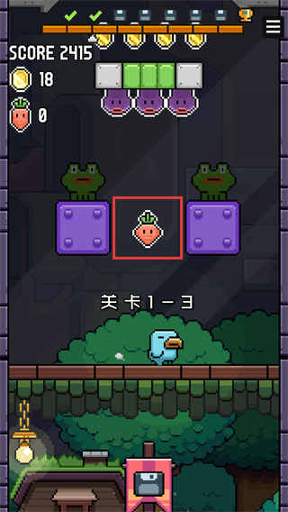 1、操控蓝色小鸟,收集胡萝卜道具,利用紫色平台跳跃,避开青蛙和紫色怪物,逐步提升得分与金币数量。